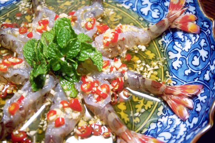 これらを予め混ぜ合わせておき、水気を拭き取った海老の上からかける。ミントを飾れば、本格的タイ料理の出来上がりだ。