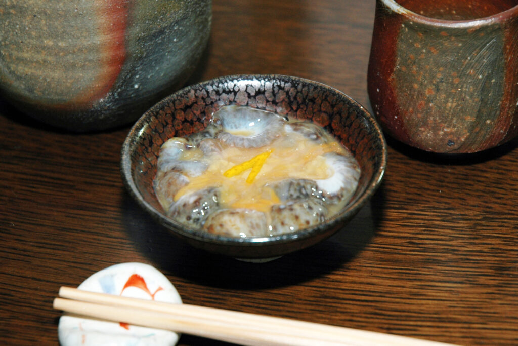海鼠酢(二杯酢や三杯酢で海鼠の身を食す)も美味しいものですが、口の中に広がる磯の香りは「海鼠の海鼠腸和え」が圧倒的。特に日本酒にはベストマッチの肴となります。