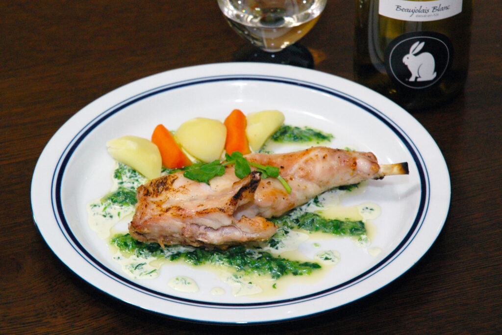 ヒット漫画『神の雫』を強引に解釈すれば、うさぎがたくさん生息する畑のワインはうさぎ肉と合うはずです!うさぎ料理とワインの新たなマリアージュを極めた自信はありませんが、2009 Beaujolais Blanc eleves en fut の豊かなミネラル感と、青リンゴ系の品の良い果実香、そして、微発泡のピリッとした味わいは、Lapin grille にピッタリだったと報告しておきます。