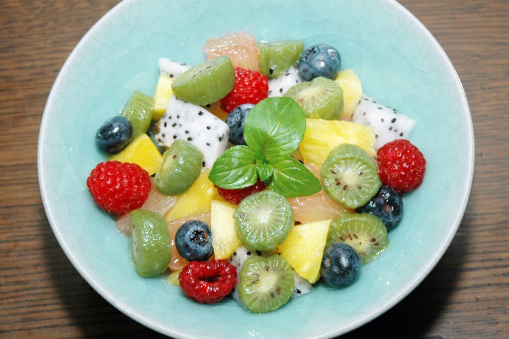 生食の他、ジャムにして食べることもできますが、今回は、他の果物と合わせて、フルーツサラダ(フルーツカクテル)にしました。 グレープフルーツ、ブルーベリー、ラズベリー、パイナップル、ドラゴンフルーツを使いました。