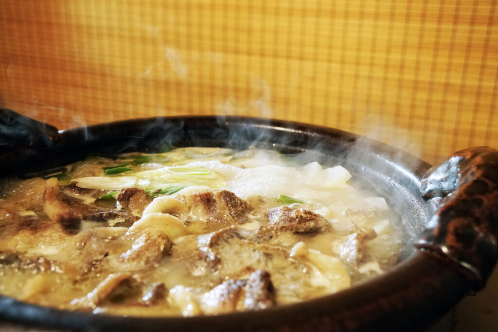 まずは土鍋に昆布だしと多めの日本酒。焼肉用に切った少し厚手の猪肉を投入したら、アクを丁寧にすくいながら中火で1時間くらい煮込みます。