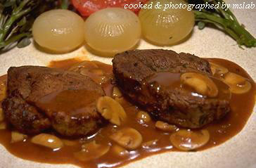 マリネ液を煮詰め、ドミグラスソース、マデラ酒、マッシュルームを加え加熱し、ソースとする。