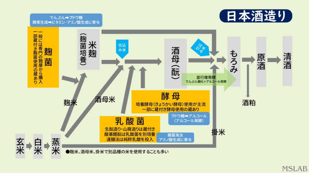 このうち乳酸菌については、山廃造り、生酛造りでは蔵付きの菌を、酸基醴酛(さんきあまざけもと)では別培養した菌を使います。速醸法では乳酸菌を使用せず、化学的に作った乳酸そのものを投入します。
